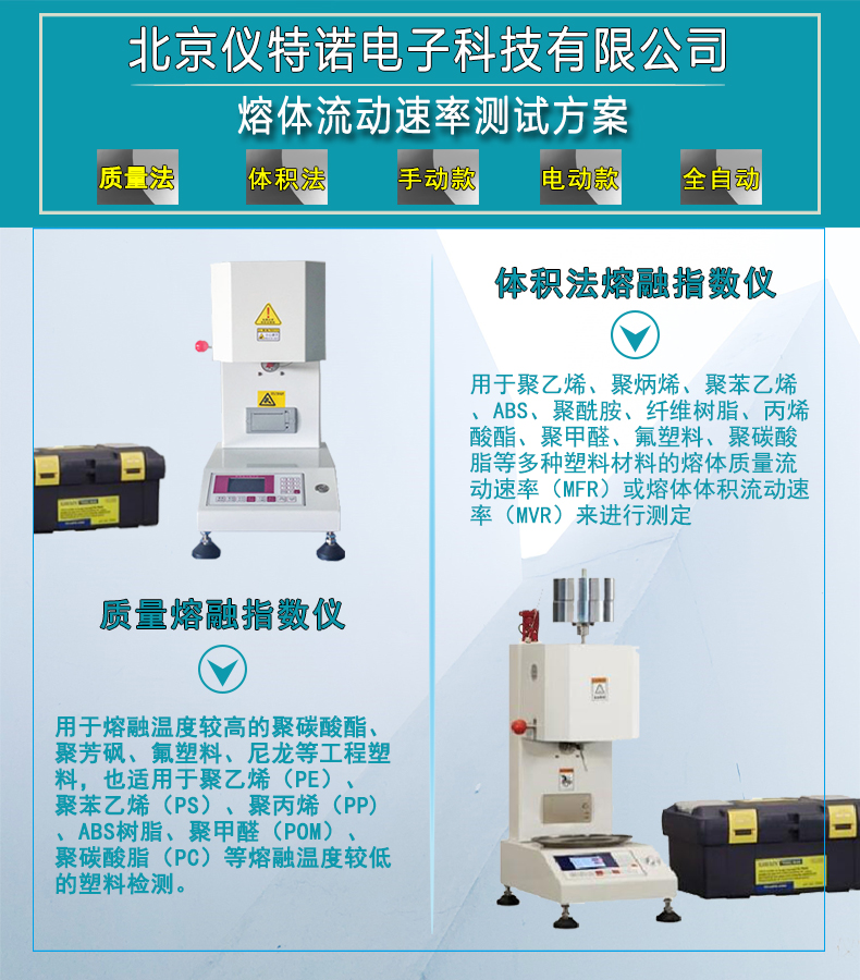用于測定各種塑料、樹脂聚合物在粘流狀態(tài)時熔體質(zhì)量率流動速率MFR值,既適用于熔融溫度較高的聚碳酸酯、聚芳砜、氟塑料、尼龍等工程塑料,也適用于聚乙烯(PE)、聚苯乙烯(PS)、聚丙烯(PP)、ABS樹脂、聚甲醛(POM)、聚碳酸酯(PC)樹脂等熔融溫度較低的塑料測試。