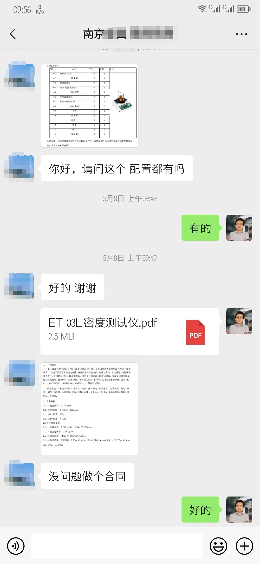加上微信,儀器商發(fā)來一個(gè)截圖確定是液體密度計(jì)ET-03L的參數(shù),不到幾分鐘就確定了合同事宜!