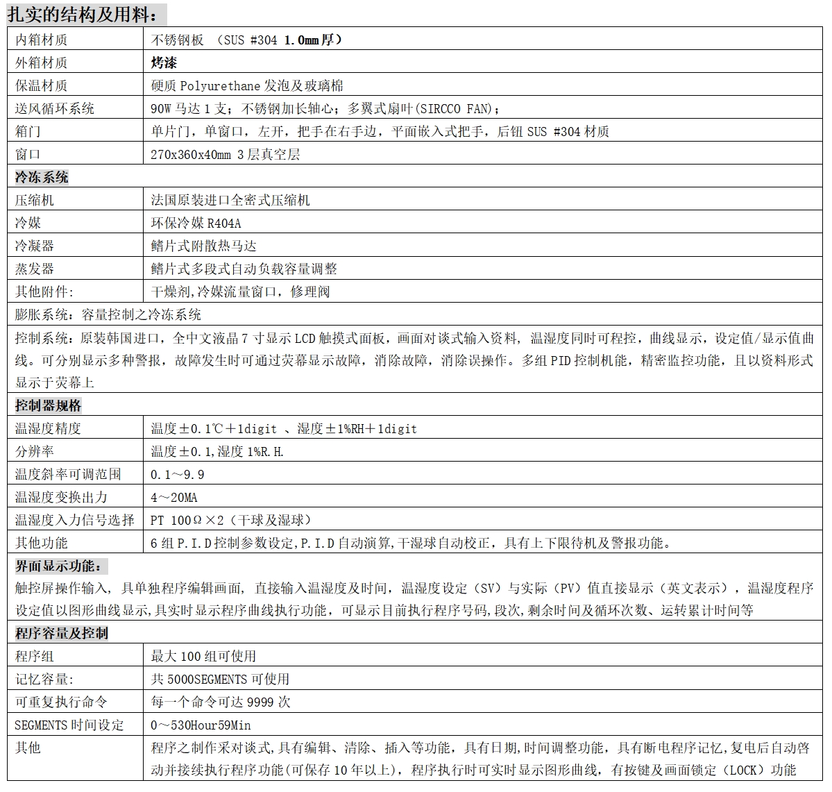 電源線4.0 mm2x3蕊;USB導(dǎo)出端子一個(gè);不銹鋼SUS #304方型沖孔鋼板置物架2片;不銹鋼可調(diào)整間距40mm置物架軌道2組;11W節(jié)能照明窗口燈一支;機(jī)體左側(cè)ψ50mm測試孔1個(gè)(附不銹鋼孔蓋1只,硅膠塞頭1只);標(biāo)準(zhǔn)測試用不織布1片;控制器使用說明書一套;操作說明書一套。